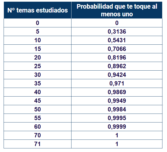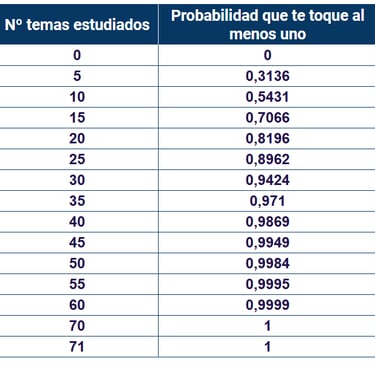 Y eso no es todo: si decidimos estudiar la mitad del temario, ¡es prácticamente seguro que podremos desarrollar al menos uno de los temas sorteados! Este análisis demuestra que, con una estrategia bien planificada y dedicación, podemos maximizar nuestras posibilidades de éxito sin necesidad de abarcar el temario completo. Lo importante es priorizar calidad sobre cantidad y trabajar de manera estratégica, asegurándote de dominar los temas clave que más posibilidades tienen de aparecer. ¡Organiza tu estudio y maximiza tus opciones!