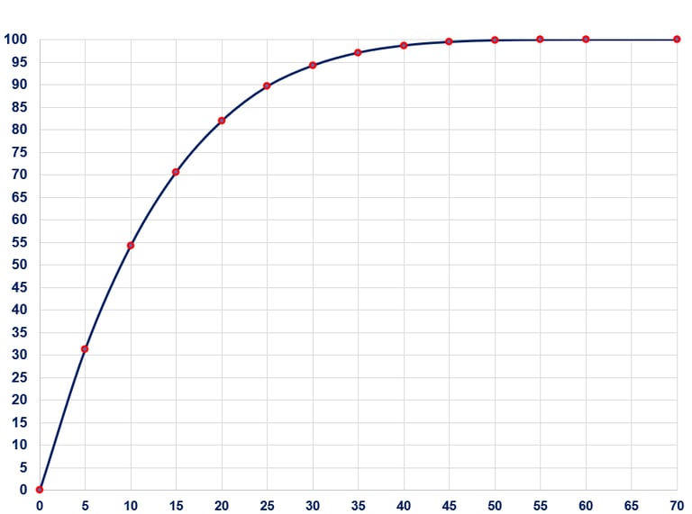 La tabla y la gráfica anteriores resumen perfectamente el cálculo de dicha probabilidad. Como puede observarse, estudiando solamente 10 temas, ¡ya es más probable que improbable que podamos escribir un tema en el examen! Si damos un paso más y optamos por estudiar 20 temas, nuestras probabilidades de éxito se disparan a más de un 80%.